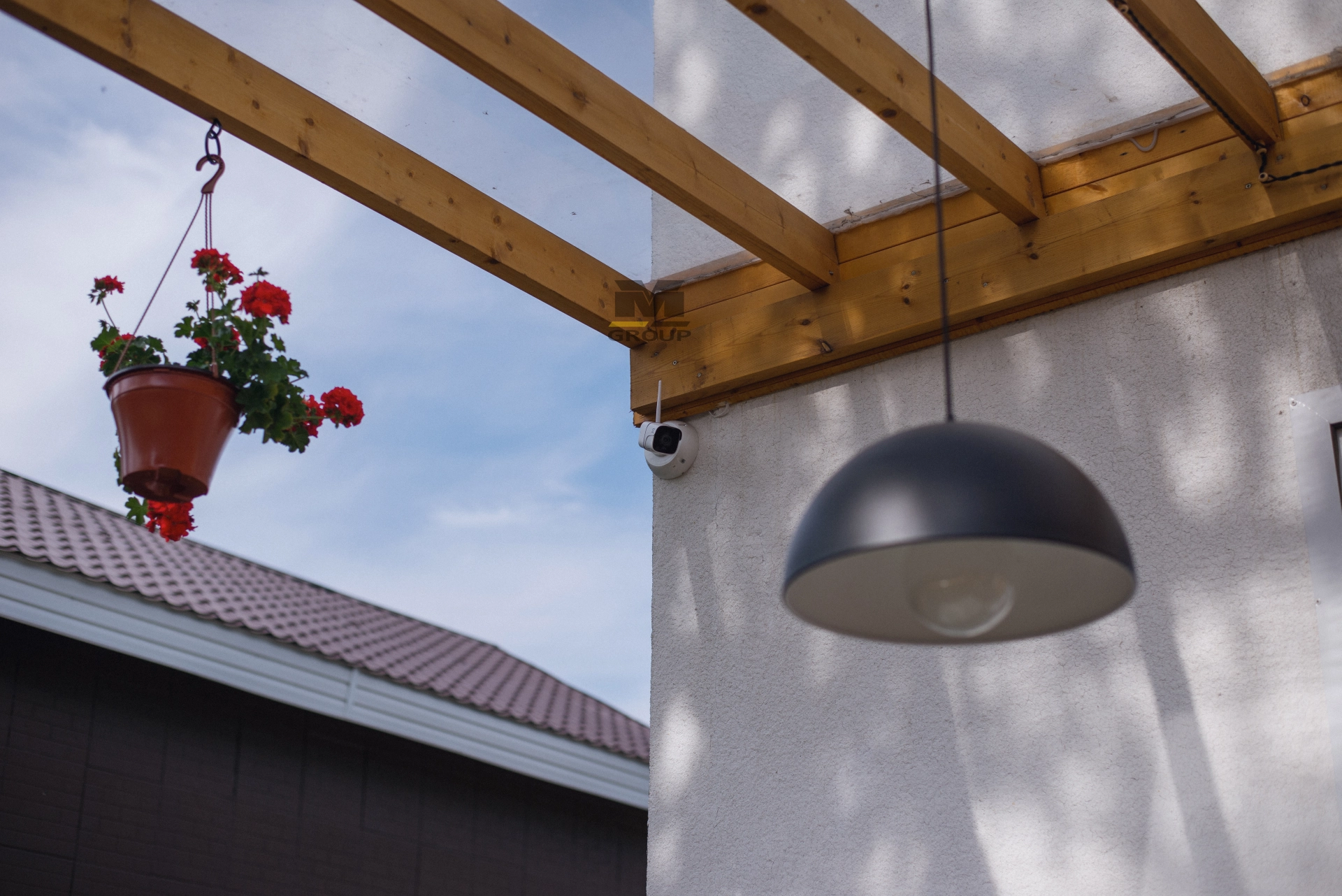 Установить 4 камеры видеонаблюдения для обеспечения полной видимости всей прилегающей территории к дому. Обеспечить хранение видеозаписей длительностью не менее 5 дней, обеспечить контроль пересечения линии забора и круглосуточный онлайн доступ к просмотру. Минимизировать количество новых проводов внутри дома.